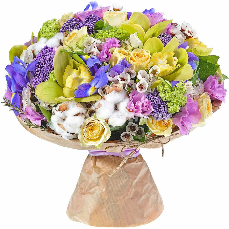 Озотамнус, хамелациум, ирис, роза, эустома, гортензия, салал, хлопок.
