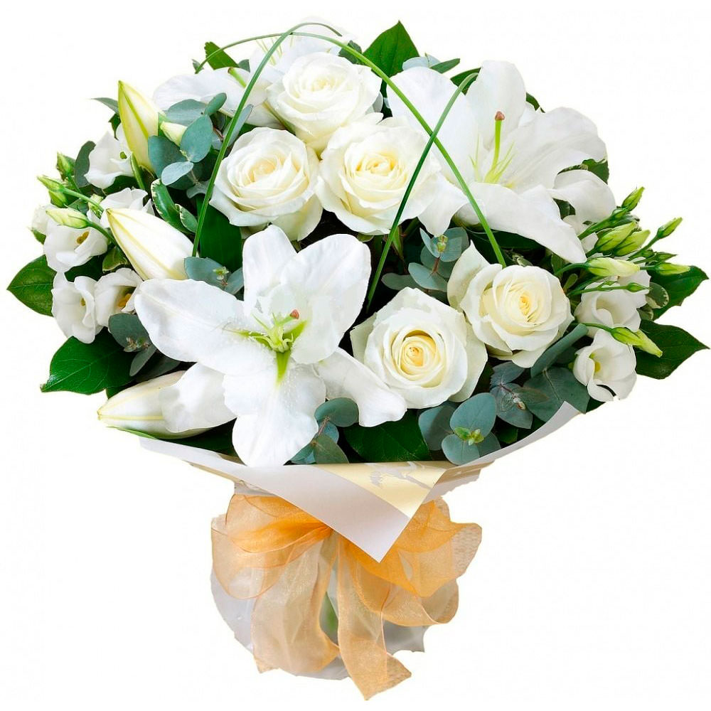 Роза белая, лилия, эустома белая, берграсс.