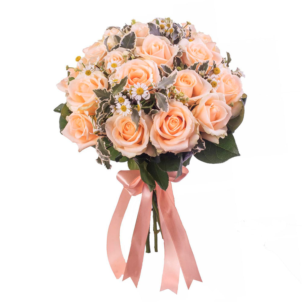 Роза одноголовая персиковая, ромашки кустовые, зелень.
