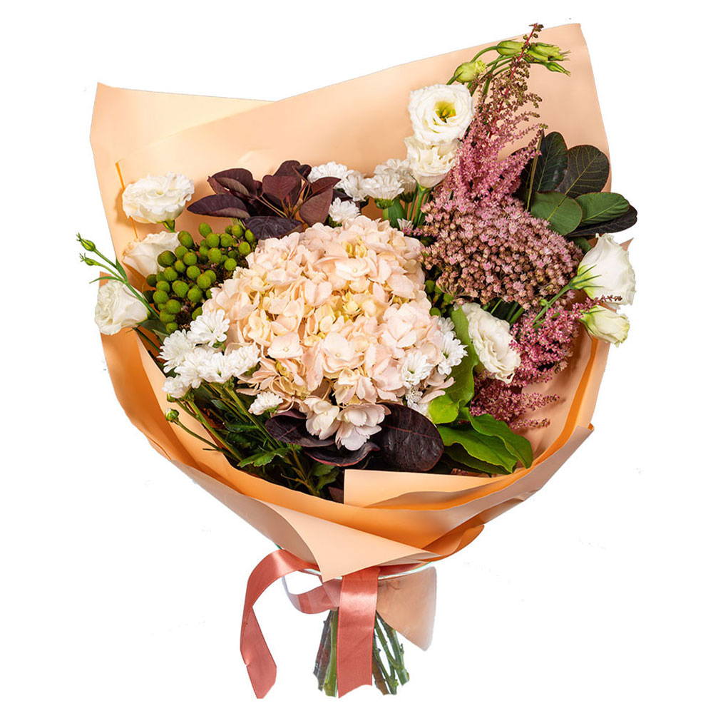 Гортензия, эустома, озотамнус, бруния, зелень.