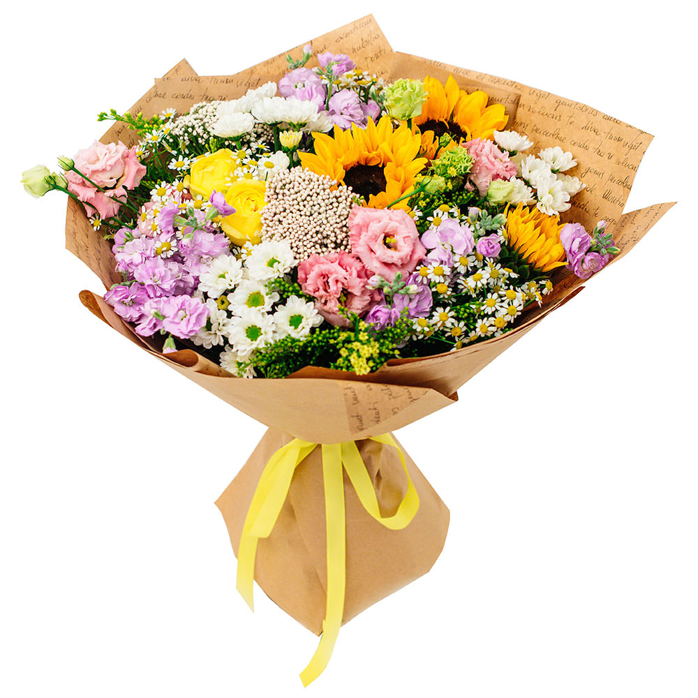 Подсолнух, эустома, озотамнус, хризантема кустовая, ромашка, маттиола, зелень.